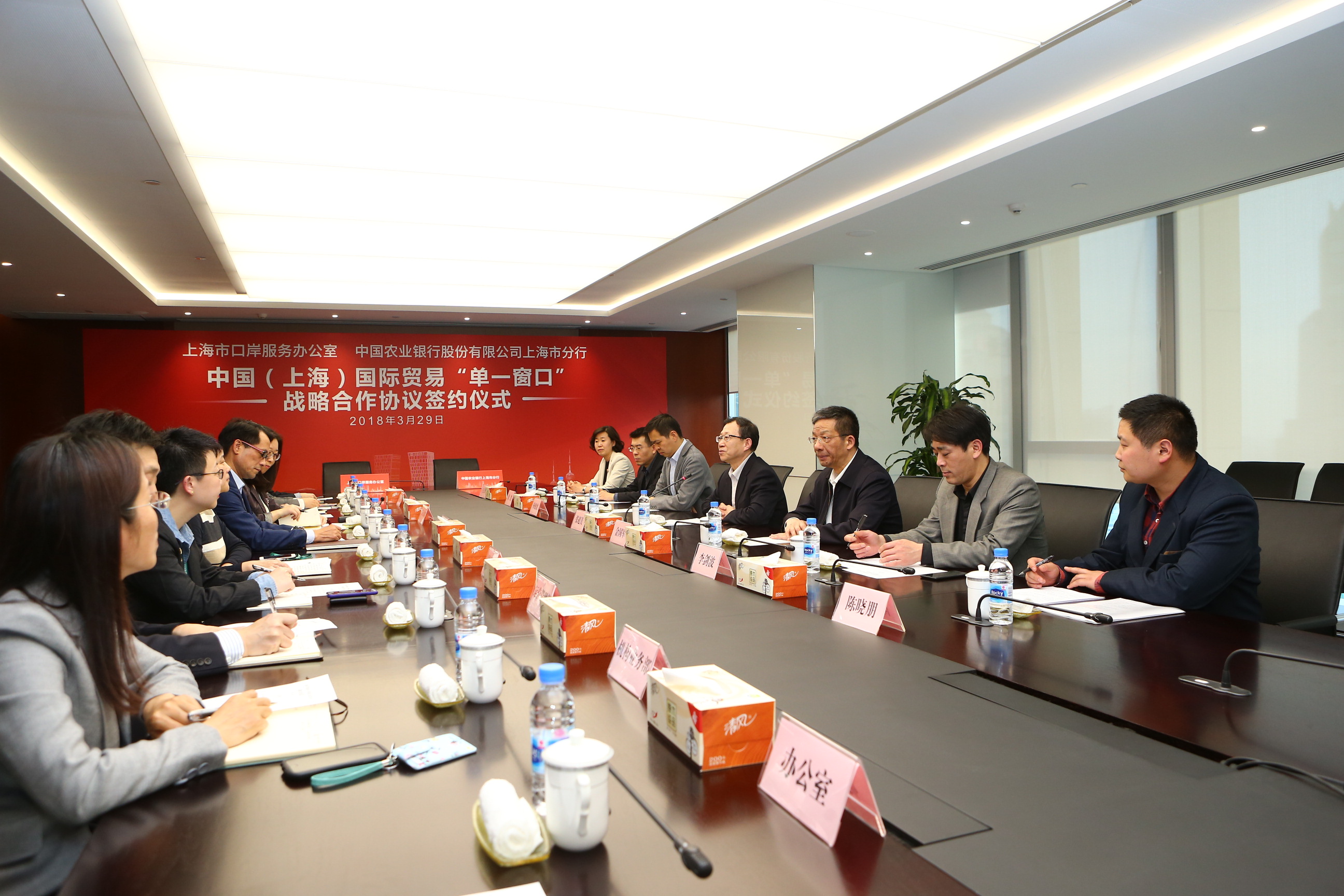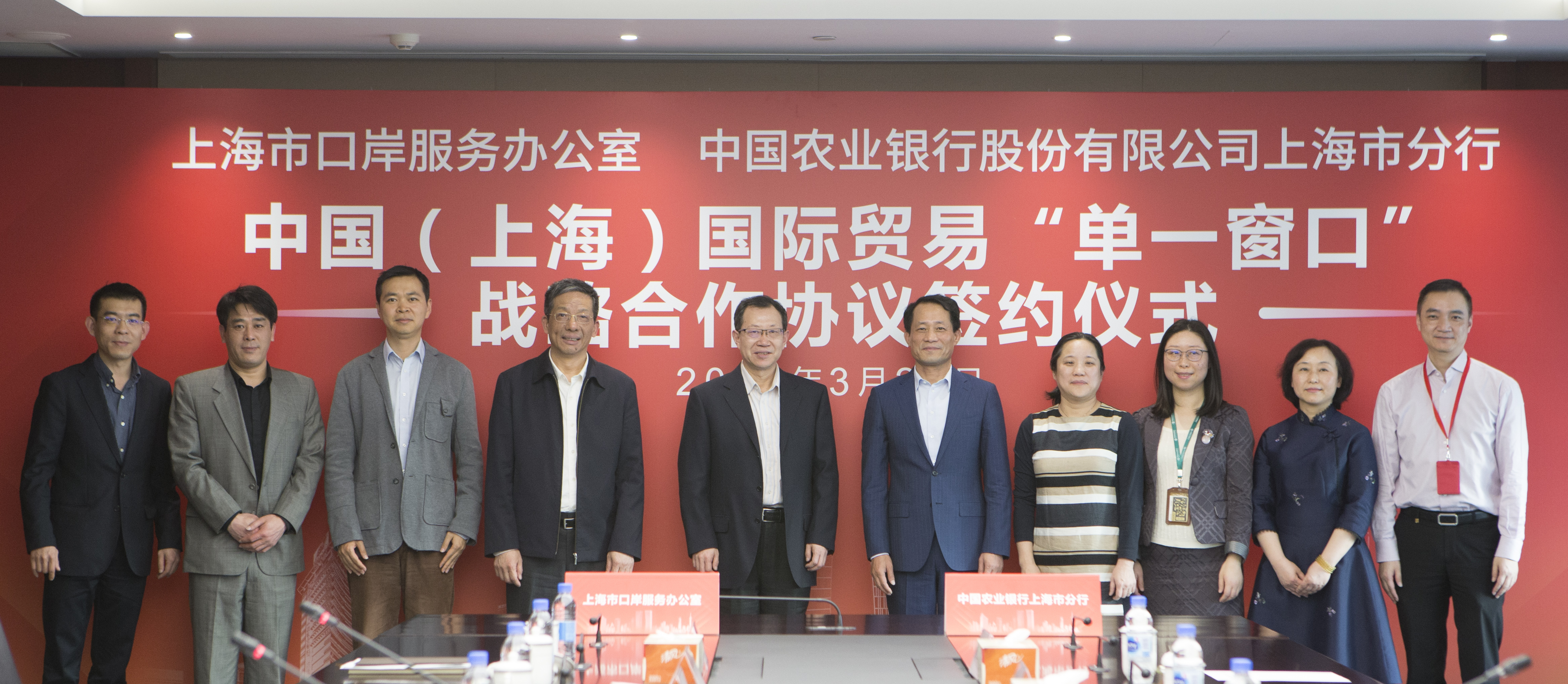 2018年3月29日,市口岸办与中国农业银行上海市分行共同签署战略合作协议。在市口岸办党组书记、主任张超美和农行上海市分行党委副书记、副行长陈其昌的见证下,金国军副主任和王蓓副行长分别代表双方签署协议。此次签约,标志着市口岸办与农行上海市分行合作序幕正式开启,同时,也标志着上海国际贸易单一窗口正式集成了涵盖中、农、工、建四大国有商业银行及中信保等金融服务功能。